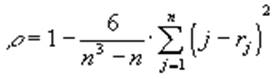 Пусть проведено n испытаний с изменениями двух признаков и получено n пар чисел (Xi,Yi), где1Ј iЈ n. Упорядочим эти пары по возрастанию чисел Xi и их порядковый номер j (1Ј jЈ n) назовем рангом чисел Xi. Если несколько чисел совпадают по величине, то каждому из них присваивается ранг, равный среднему арифметическому их номеров. Порядок чисел Yi также, естественно, изменится. Если отдельно упорядочить числа yi по возрастанию, то их порядковый номер r тоже становится рангом чисел Yi. Но поскольку эти числа имеют смысл только в паре между собой, ранги r чисел Yi перемещаются и получается пар n чисел рангов (j, rj), где 1Ј jЈ n.