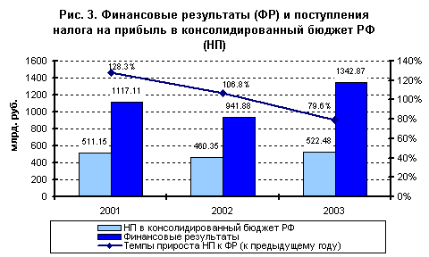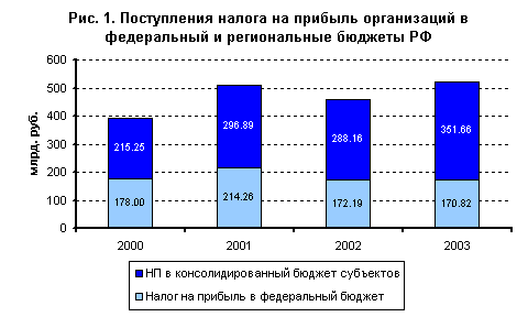 В 2003 г. объем поступлений налога на прибыль организаций на федеральном уровне, по данным Минэкономразвития РФ, составил 7,7% от доходов федерального бюджета (170,82 млрд. руб.), что на 0,8% в абсолютном значении меньше по сравнению с предыдущим годом. В консолидированный бюджет субъектов РФ сборы налога на прибыль выросли по сравнению с 2002 г. на 22% и составили, по данным Минфина РФ, 351,66 млрд. руб. Итого в консолидированный бюджет РФ по налогу на прибыль в 2003 г. поступило 522,5 млрд. руб., что на 13,5% больше чем в 2002 г.