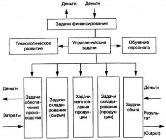 Производственный трансформационный процесс состоит из частных задач обеспечения (снабжения), складирования (хранения), изготовления продукции, сбыта, финансирования, обучения персонала и внедрения новых технологий, а также управления.