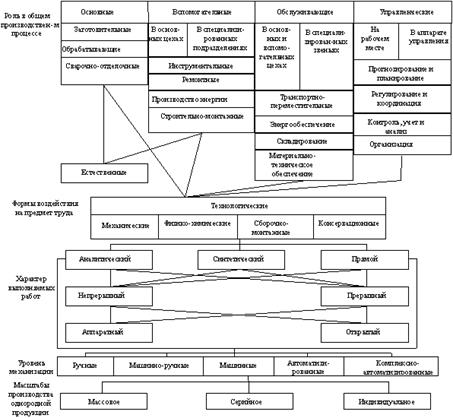Технологические производственные процессы классифицируются по методам превращения предметов труда в готовый продукт на: механические, химические, монтажно-демонтажные (сборочно-разборочные) и консервационные (смазка, покраска, упаковка и т.п.). Эта группировка служит базой для определения состава оборудования, методов обслуживания и пространственной его планировки.
