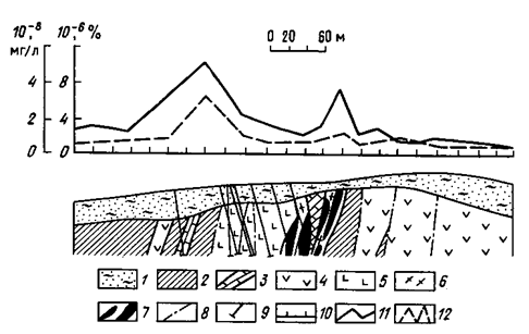 Несмотря на процессы самоочищения природных вод от содержаний рудных элементов, их повышенные, аномальные концентрации сохраняются в речных и подземных водах на расстояниях до 500—1000 м, иногда до нескольких километров от месторождений. Определяется это разнообразием форм нахождения рудных элементов в сложных многокомпонентных системах, которые представляют собой природные воды. Миграция рудных элементов в водах протекает в виде простых ионов, комплексных неорганических соединений с различными лигандами, в частности в анионной форме, а также в виде различных металлорганических соединений повышенной растворимости. Практика гидрохимических исследований подтверждает реальность обнаружения при поисках водных ореолов и потоков рассеяния рудных месторождений. Пример гидрохимического профиля представлен на рис. 1 приложения.