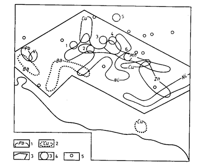 Выделение аномалий. В процессе математической обработки отдельно для каждого вида растений, произрастающих на определенных участках сопоставимых проб, устанавливаются аномальные содержания элементов в золе. Для выявления биогеохимических аномалий на планшет особыми значками или цветом выносятся содержания, значительно меньшие фонового, аномальные для двух и девяти коррелирующихся проб, а также для единичных проб. Затем выделяют “отрицательные” и “положительные” аномалии для каждого элемента на отдельном планшете. Потом составляется сводная карта аномалий с выделением на ней отдельных аномальных зон (рис. 5 приложения).
