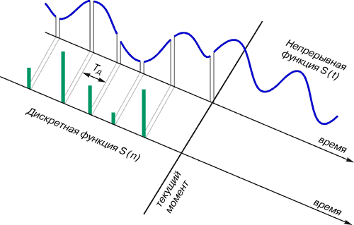 Для получения дискретной функции времени надо подвергнуть процессу дискретизации непрерывную функцию времени. Это изображено на рис.2. Вырезаем отдельные значения из непрерывной функции, выстраивая дискретную функцию времени. Период одного цикла его работы Tд