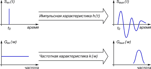 ПФ часто применяется при решении задач, возникающих в теории автоматического регулирования и управления, в теории фильтрации и т.д. Разберем один из примеров. Имеется некий линейный фильтр – изготовленный то ли в виде набора спаянных между собой резисторов, конденсаторов и катушек индуктивности, то ли в виде модульной конструкции интегральных микросхем. Известен также входной сигнал (на рис.3 в качестве входного сигнала изображена дельта-функция, то есть импульс исчезающе короткой длительности и бесконечно большой амплитуды). Необходимо определить, какой сигнал появится на выходе нашего фильтра.