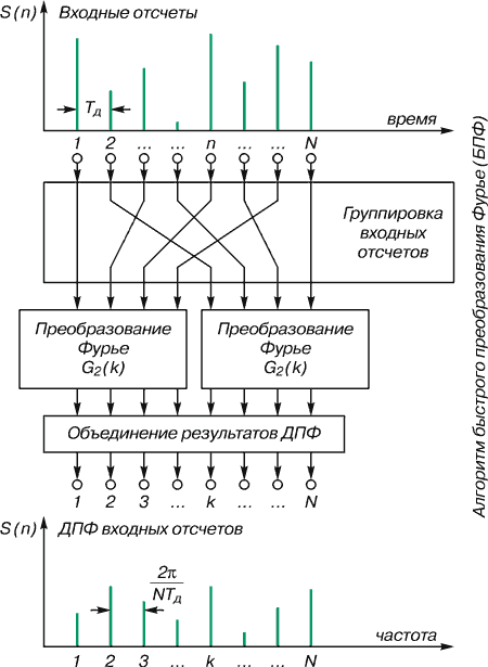 Если выполнять ДПФ входной последовательности, так сказать, впрямую – строго по исходной формуле, то потребуется много времени (особенно если количество входных отсчетов велико). Конструктивнее использовать принцип «разделяй и властвуй», лежащий в основе алгоритма БПФ. Согласно ему входная последовательность делится на группы (например, четные и нечетные отсчеты), и для каждой из них выполняется ДПФ, а затем полученные результаты объединяются. В итоге получается ДПФ входной последовательности – и существенная экономия времени. Поэтому описанный алгоритм так и назвали – быстрое преобразование Фурье.