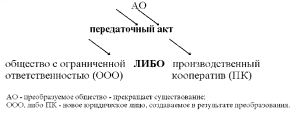 Преобразованием общества признается изменение его организационно-правовой формы. Акционерное общество (далее -АО) вправе преобразоваться только в общество с ограниченной ответственностью или в производственный кооператив (ст.20 ФЗ "Об АО"). При преобразовании АО к вновь возникшему юридическому лицу переходят все права и обязанности реорганизованного АО в соответствии с передаточным актом.