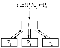 На сайте, который приведен ниже, 3 нижних страницы эквивалентны между собой во всех смыслах. Соответственно, все они будут иметь одинаковый PageRank (P2). Головная страница отличается от них и имеет PR=P1.