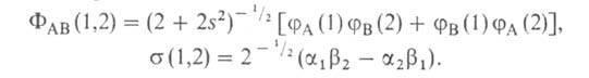 Для простейшей молекулы Н2 ф-цию Ф(1,2) строят из 1s-орбиталей атомов Н, обозначаемых для разных ядер как и , а ф-цию (1,2) - из одноэлектронных спиновых ф-ций и (спин-функций), описывающих состояния электронов с противоположно направленными спинами: