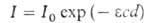 1. Закон Бугера-Ламберта: если среда однородна и слой в-ва перпендикулярен падающему параллельному световому потоку, то I = I0 exp (— kd), где I0 и I-интенсивности соотв. падающего и прошедшего через в-во света, d-толщина слоя, k-коэф. поглощения, к-рый не зависит от толщины поглощающего слоя и интенсивности падающего излучения. Для характеристики поглощат. способности широко используют коэф. экстинкции, или светопоглощения; k' = k/2,303 (в см-1) и оптич. плотность А = lg I0/I, а также величину пропускания Т= I/I0. Отклонения от закона известны только для световых потоков чрезвычайно большой интенсивности (для лазерного излучения). Коэф. k зависит от длины волны падающего света, т.к. его величина определяется электронной конфигурацией молекул и атомов и вероятностями переходов между их электронными уровнями. Совокупность переходов создает спектр поглощения (абсорбции), характерный для данного в-ва.