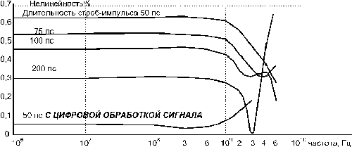 Для уменьшения нелинейности при высоких уровнях сигнала необходимо использовать цифровую обработку сигнала, поступающего с выхода преобразователя. Для сглаживания коэффициента передачи с помощью численного моделирования подбирается соответствующая корректировочная функция. Для кольцевого диодного стробпреобразователя наиболее простая и подходящая , где - частота сигнала, - вносимый стробпреобразователем фазовый сдвиг, k0 и k1 - эмпирически найденные или подобранные с помощью численного моделирования коэффициенты. Далее значение выходного сигнала умножается на значение корректировочной функции. На рис. 3 показан график нелинейности стробпреобразователя с длительностью стробимпульса 50 пс при воздействии сигнала 1 В с цифровой обработкой сигнала, где k0=0,013625, k1 = 1,625*10-12. На рис. 4 показан аналогичный график для напряжения сигнала 0,5 В. Коэффициенты k0 и k1 зависят также от значения сигнала. Но эта зависимость для высоких уровней сигнала, где целесообразно применять такие цифровые фильтры из-за относительно большой нелинейности (0,1-1% ), может быть выражена достаточно просто - линейной функцией.