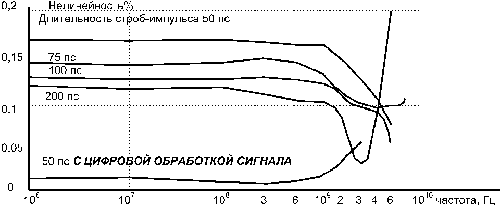 Численное решение для стробпреобразователя с треугольным стробимпульсом и следующими параметрами диодов: сек., , С - емкость корпуса диода 0,3 пФ, L - индуктивность диода Гн, Rd - сопротивление базы диода 2 Ом, показывает заметную зависимость нелинейности от частоты преобразуемого сигнала. Для высоких уровней сигнала (порядка 1 В) нелинейность уменьшается с частотой. Уменьшение емкости конденсатора преобразователя приводит к уменьшению уровня нелинейности, так как при длительности стробимпульса 75 пс и емкости 0,5 пф нелинейность в диапазоне от 10 МГц до 3 ГГц 0,3-0,5% , то при емкости 2 пф 0,5-0,7. Увеличение длительности стробимпульса ведет к уменьшению нелинейности, но и к уменьшению коэффициента передачи на высоких частотах, а также к появлению ярко выраженного минимума нелинейности (рис.3, 4). При низком уровне сигнала график зависимости нелинейности представляет собой сложную кривую, имеющую несколько минимумов и максимумов.