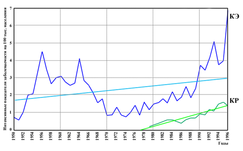 Рис.1. Динамика заболеваемости КЭ за 1950 - 1996 гг. и КР за 1979 - 1996 гг. в РФ и трендовые линии