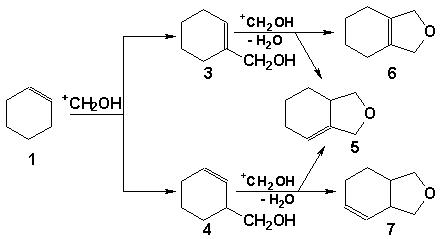 Реакционная смесь, полученная в условиях сильного разбавления, изучалась хроматомасс-спектрометрическим методом. Взаимодействие циклогексена с протонированным мономером формальдегида может привести к образованию как - так и -ненасыщенного спирта (НС), который, в свою очередь, будет претерпевать дальнейшие превращения. В зависимости от НС (3 или 4) в реакционной смеси должны присутствовать различные продукты: спирт 3 должен приводить к структурам 5 и 6, а спирт 4 будет давать структуры 5, 7.