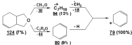 В результате проведенного исследования на основе сравнения масс-спектра НС с известным масс-спектром соединения 3 методом исключения нами предположено наличие в реакционной смеси спирта 4. Образование 3-гилроксиметил-1-циклогексена подтверждается и тем фактом, что в реакционной смеси обнаруживается довольно большое количество 3-оксабицикло[4.3.0]-6-нонена (7). Пути расщепления соединения 7 соответствуют данным полученного масс-спектра.