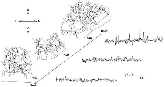 Опираясь на существующее в литературе мнение о важном значении дендритов в функциональной организации нервной системы [2] и данные о том, что для определенного вида нейронов, в частности, мультиполярных и веретеновидных клеток, характерен определенный паттерн отводимой от них фоновой импульсной активности [14], мы предположили, что выявленные нами особенности нейронной организации СОа, РАС, СОр, а именно преобладание определенных форм нейронов, пространственное их расположение, степень разветвленности и протяженности отростков, а также разобщенность трех отделов в пространстве, не могут не сказаться на физиологических особенностях отделов кортикального ядра.
