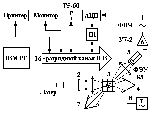 Блок-схема установки изображена на рис. 1. Световой поток от источника света 1 (лазера или лампы накаливания) проходит через поляризатор 2 и направляется через систему линз в электрооптическую ячейку 3. Исследуемая среда находится в межэлектродном пространстве электрооптической ячейки 3, где освещается светом лазера и подвергается воздействию ориентирующего электрического поля. Прямой свет от источника 1 поглощается светоловушкой 4, а свет, рассеянный модулирующей средой, попадает на фотоумножитель (ФЭУ) 5. Измерение рассеянного светового потока производится на фоне черного тела, выполненного в виде конуса-светоловушки 7. Ориентирующее синусоидальное напряжение вырабатывается генератором синусоидальных колебаний звуковой частоты 8 с высоковольтным повышающим трансформатором на выходе. Появление в межэлектродном пространстве ячейки 3 ориентирующего поля приводит к возникновению периодических колебаний несферических частиц модулирующей среды, обладающих собственным или наведенным дипольным моментом, что немедленно сказывается на интенсивности рассеянного света, которая регистрируется фотоэлектронным умножителем ФЭУ-85. Сигнал от ФЭУ поступает на вход широкополосного усилителя У7-2. Предусмотрено измерение или компенсация постоянной составляющей выходного сигнала ФЭУ. Выход усилителя соединяется с измерительно-вычислительным комплексом (ИВК) для исследования спектральных характеристик. ИВК реализован на базе микро-ЭВМ IBM-PC с объемом ОЗУ 16 Mбайт. В состав комплекса входят аналого-цифровой преобразователь Ф-4223, генератор тактовых импульсов Г5-60, принтер и фильтр нижних частот (ФНЧ).