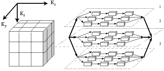 Наиболее часто применяемый метод осреднения фильтрационных параметров заключается в численном моделировании потока жидкости в заданном направлении через боковую поверхность блока, состоящего из набора геологических ячеек.