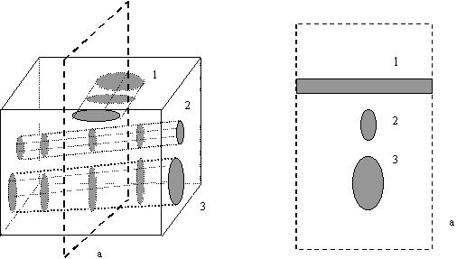 Для определения осредненной проницаемости по одному из направлений Ох, Оу или Оz выбираются те трубки тока, которые пересекают выбранное тело в заданном направлении. В данном случае для нахождения компоненты тензора проницаемости Кх используются песчаные тела 2 и 3, а для компоненты Ку - тело 1 (рис. 3). Считаем, что все трубки тока идут параллельно граням параллелепипеда.