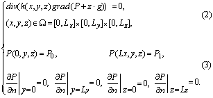 Для определения проницаемости в направлении оси Ox - Kx решается задача (2) с непроницаемыми границами, перпендикулярными осям Oy и Oz, а на границах области при x=0 и x=Lx задается перепад давления (P0 P1). При известном распределении поля давления определяется фильтрационный поток и для данной фильтрационной ячейки вычисляется модифицированное Kx. При задании соответствующих краевых условий (3) и численном решении задачи (2)-(3) с новыми изолированными границами и выбранными направлениями перетока определяются остальные компоненты тензора проницаемости фильтрационной ячейки [3-5].
