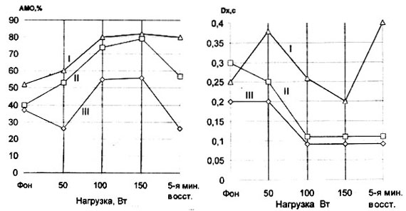 Амплитуда моды (АМО) кардиоритмограммы на первой ступени нагрузки изменялась разнонаправленно: у обследуемых с высокой PWC170 (III группа) АМО уменьшалась и только при нагрузке 100 Вт возрастала до 56%. У остальных обследуемых начиная уже с первой ступени нагрузки АМО увеличивалась до 60-80% (см. таблицу и рис. 1). Следовательно, у обследуемых с низкой PWC170 (I группа) сердце работало в стабильном ритме с минимальным количеством отклонений в ту или иную сторону в условиях минимального уровня степеней свободы. Такое состояние может свидетельствовать о "жесткой" регуляции сердечного ритма нервной системой. Это подтверждает и динамика показателя Х (разброс кардиоинтервалов за 100 кардиоциклов), который возрастает при нагрузке в 50 Вт у обследуемых с высоким уровнем PWC170 (см. таблицу и рис. 2).