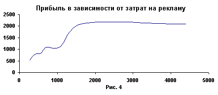 Величины затрат на рекламу в этих случаях приводить не будем, их легко определить из таблицы 3. С учетом возможности подачи рекламы в оба издания построим график зависимости прибыли от затрат на рекламу.
