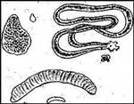 Кладки яиц у различных комаров-дергунов (Chironomus). Увел., рядом нарисованы кладки в ест. вел.