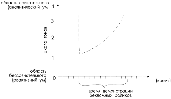 Из анализа приведенной выше ситуации следует однозначный вывод: для достижения успеха – в данном случае воздействия на психику потребителя – качество рекламной продукции не имеет принципиального значения. Во всяком случае, это характерно для обществ, средний тон потребителя которых находится в пределах тона 2,0 (±0,5). Важно не качество, а количество. Даже самый красивый рекламный ролик в мире не принесет успеха рекламодателю, если он будет показан лишь раз либо от случая к случаю. В рекламной компании гораздо важнее повторяемость. Чем чаще потребитель будет сталкиваться с рекламой того или иного товара, тем он больше будет внутренне злиться, раздражаться и соответственно тем беспомощней будет его психика в сложившиеся ситуации. Если добиться того, что кривая эмоционально-психического состояния человека (см. рис.1) все время будет оставаться внизу – в области тонов 1,5...2,0, – то этим вы по существу полностью подчините себе потребителя и одержите над ним верх. Далее можете «брать его голыми руками».