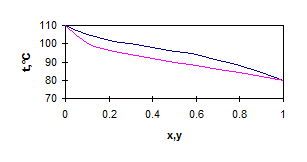 По средним составам фаз определим температуру в верхней части колонны 89°С, в нижней части колонны 102°С.