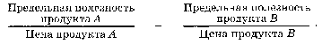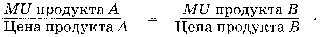 Согласно правилу максимизации полезности потребитель может максимизировать полезность, если он распределит свой денежный доход таким образом, чтобы последний доллар, израсходованный на продукт A, а также последний доллар, израсходованный на продукт B, и так далее принесут одинаковое количество добавочной, или предельной, полезности. Предельная полезность в расчете на доллар, затраченный на продукт A, обозначим как MU продукта A, деленное на цену продукта A, а предельная полезность в расчете на доллар затрат на продукт B — как MU продукта B, деленное на цену продукта B. Правило максимизации полезности требует, чтобы эти соотношения были равны. А именно: