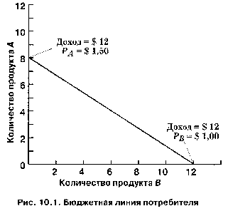 Бюджетная линия потребителя показывает различные комбинации двух продуктов, которые могут быть приобретены при фиксированной величине денежного дохода (рис. 10.1).