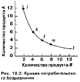 Чем можно объяснить выпуклость кривой безразличия? Ответ заключается в том, что субъективная готовность потребителя к замещению продукта A продуктом B (или наоборот) зависит от начальных количеств продуктов A и B. В общем, чем больше количество продукта B, тем меньше предельная полезность его дополнительных единиц. Аналогичным образом, чем меньше количество продукта A, тем больше его предельная полезность. Это значит (см. рис. 10.2), что при перемещении вниз по кривой потребитель будет готов отказаться от все меньшего и меньшего количества продукта A в порядке компенсации на приобретение каждой дополнительной единицы B. В результате получаем кривую с убывающим наклоном, т.е. выпуклую по отношению к началу координат. Иначе можно сказать, что MRS снижается по мере продвижения вправо вдоль кривой безразличия.