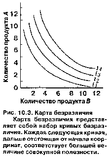 Кривая безразличия на рисунке 10.2 соответствует некой постоянной величине совокупной полезности, или удовлетворения. В то же время существует возможность — и весьма полезная для нашего анализа — изобразить целую серию кривых безразличия, или, другими словами, карту безразличия, как показано на рисунке 10.3.