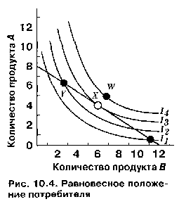 Определить равновесное положение потребителя можно путем совмещения линии потребительского бюджета и карты безразличия, как это показано на рисунке 10.4. Согласно определению бюджетная линия показывает все комбинации продуктов A и B, доступные для потребителя при данной величине его денежного дохода и данном уровне цен продуктов A и B. Вопрос заключается в следующем: какая из этих доступных потребителю комбинаций окажется для него наиболее предпочтительной? Ответ: такая комбинация, которая принесет ему наибольшее удовлетворение или наибольшую полезность.