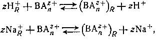 Катиониты являются полифункциональными соединениями, состоящими из высокомолекулярных анионов н простых катионов; промышленные синтетические вещества обычно являются формальдегидными или полистирольными смолами, которые содержат фенольную, сульфо- или карбоксильную группы в кислой форме или в виде соответствующей натриевой соли. Смолы не растворяются в воде и в большинстве органических растворителей. Если их привести в равновесие с раствором, содержащим ионы металла или другие катионы (например, ВАnz+ ), они могут участвовать в реакции обмена типа