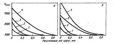 Рисунок 3 - Зависимость микротвердости титанового сплава ВТ6 от расстояния до поверхности после нагрева на воздухе в течение 1(а), 3(б) и 6(в)ч при 750(1), 950(2), 1050(3), 1200°С(4).