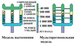 Согласно модели вытеснения, все современные люди — европейцы, азиаты, американцы — потомки относительно небольшой группы, вышедшей из Африки примерно 100 тысяч лет назад и вытеснившей представителей всех прежних волн расселения. Сторонники мультирегиональной теории происхождения анатомически современного человека считают, что существовало генетическое взаимопроникновение между представителями разных волн расселения из Африки (по последним данным, предполагается, что таких волн было три: первая — 1,8–1,6 миллиона лет назад, вторая — 800–400 тыс. лет назад и третья — около 100 тысяч лет назад).
