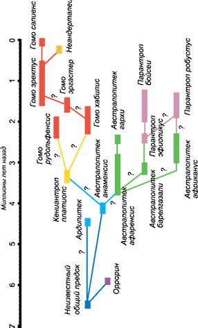 Различные представители семейства гоминид (вероятные предки и близкие родственники современного человека). Большая часть связей между ветвями эволюционного дерева пока под вопросом.