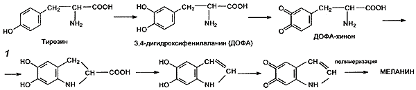 Меланин — это высокомолекулярное соединение сложного строения. Его цвет и защитные функции во многом обусловлены тем, что в нём есть неспаренные электроны. Механизм образования меланина полностью не выяснен, но известно, что важную роль в нём играют аминокислота тирозин и фермент тирозиназа (рис. 1). Он синтезируется в особых клетках кожи — меланоцитах, а регулирует этот процесс гормональная система, в основном гормоны гипофиза (так называемые меланоцитстимулирующие гормоны). Взаимодействуя с молекулой белка, меланин формирует тёмные зёрнышки размером от 0,1 до 2 мкм. Меланоциты через свои отростки как бы впрыскивают эти зёрнышки в клетки верхних слоёв кожи, пока почти весь меланин не окажется в наружном роговом слое. Оттенок загара, возможно, зависит от того, в каком состоянии находится меланин: в окисленном он чёрный, а в восстановленном — жёлто-коричневый.