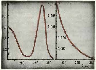 Рис. 2. Эритемная чувствительность кожи, обозначенная буквой ч, имеет два максимума — в областях жёсткого и среднего ультрафиолета. При мягком ультрафиолете чувствительность на два порядка ниже, так что пришлось пристроить отдельно „окончание“ графика.