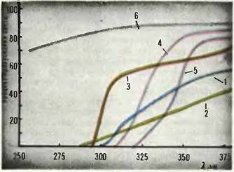 Рис. 5. Прозрачность шести распространённых материалов в ультрафиолетовой области: 1 — лавсановая плёнка, 0,15 мм; 2 — поливинилхлоридная плёнка, 0,15 мм; 3 — оргстекло, 2,5 мм; 4 — оконное стекло, 1 мм; 5 — то же, 6 мм; 6 — оптический кварц, 3 мм.