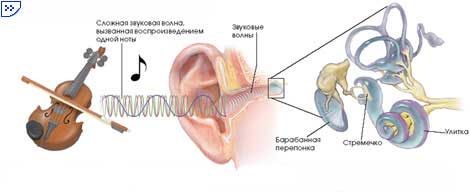 Достигающие человека звуки преобразуются структурами наружного и среднего уха в колебания жидкости во внутреннем ухе. Крошечная косточка среднего уха, стремечко, „сотрясает“ улитку, изменяя давление заполняющей её жидкости.