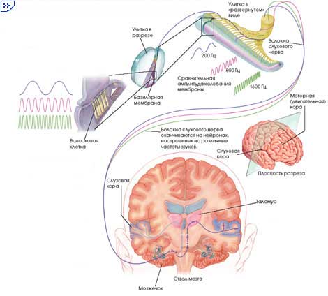 Также мы получили полное представление о том, как головной мозг реагирует на музыку. Слуховая система, как и все прочие сенсорные системы организма, имеет иерархическую организацию. Она состоит из цепочки центров, которые перерабатывают нервные сигналы, направляющиеся из уха в высший отдел слухового анализатора — слуховую кору. Переработка звуков (например, музыкальных тонов) начинается во внутреннем ухе (улитке), сортирующем сложные звуки (издаваемые, например, скрипкой) на составляющие элементарные частоты. Затем по волокнам слухового нерва, настроенным на разную частоту, улитка посылает информацию в виде последовательности нейронных разрядов (импульсов) в головной мозг. В итоге они достигают слуховой коры в височных долях мозга, где каждая клетка реагирует на звуки определённой частоты. Кривые частотной настройки соседних клеток перекрываются, т. е. разрывы между ними отсутствуют, и на поверхности слуховой коры формируется частотная карта звуков.