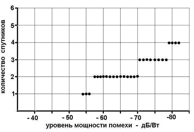 Зависимость количества принимаемых спутников от уровня мощности помехи